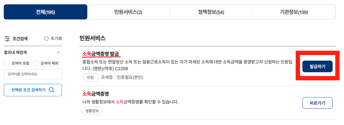 접속 후, 사이트 상단 중간쯤 찾으시는 서비스에 '소득금액증명원'을 검색하여 주세요.