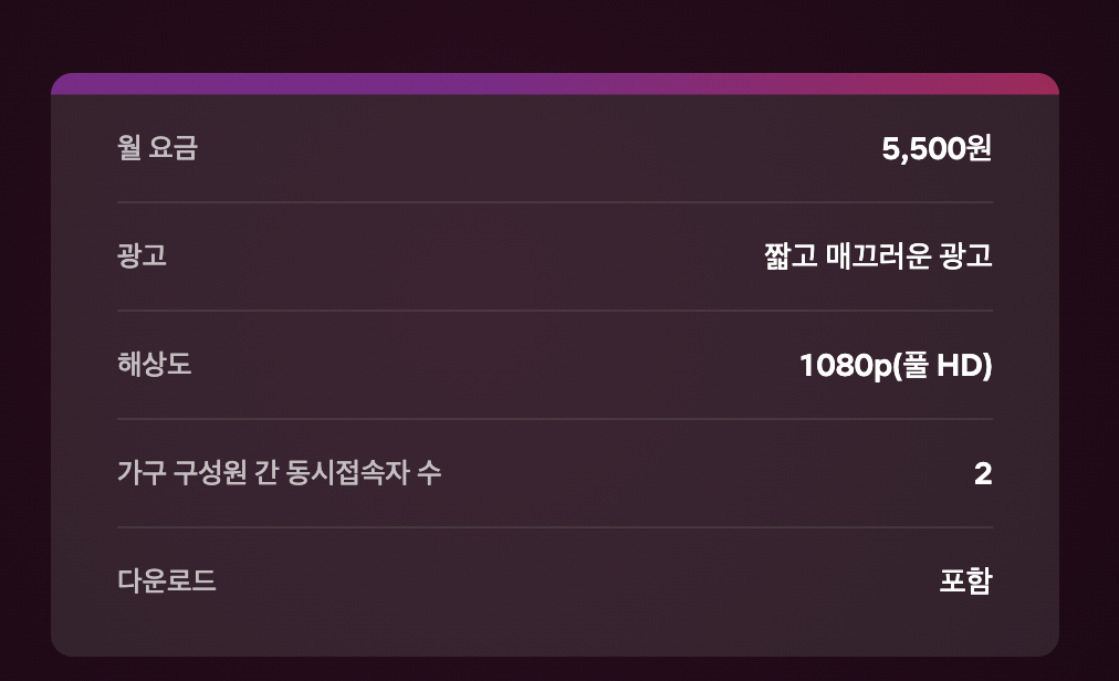 1. 넷플릭스 광고형 스탠다드 요금제는 월 5,500원입니다. 대부분의 영화 및 프로그램(몇 가지 예외 제외)에 대한 액세스가 포함되어 있으며 풀 HD(1080p)로 한 번에 두 대의 기기에서 스트리밍할 수 있으며, 두 대의 기기에서 모바일 다운로드를 지원합니다. 단, 이 요금제에는 콘텐츠 재생 중 광고가 포함되어 있습니다.