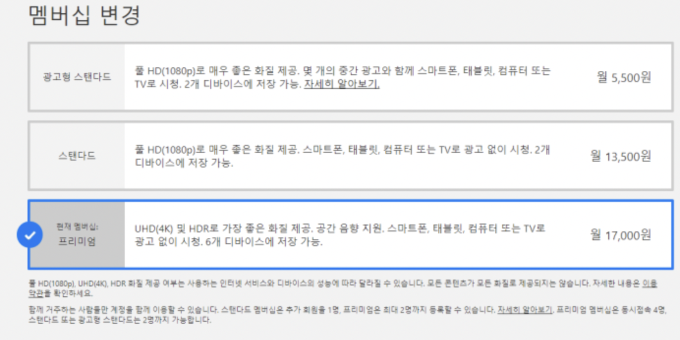 3. 프리미엄 요금제는 17,000원/월의 요금제로 최대 4개 기기에서 4K UHD 및 HDR 스트리밍을 동시에 지원합니다. 또한 6개의 장치에 다운로드하여 향상된 오디오 품질(공간 오디오)을 즐길 수도 있습니다. 또한 비용을 지불하면 최대 2명의 추가 회원을 추가할 수 있습니다.