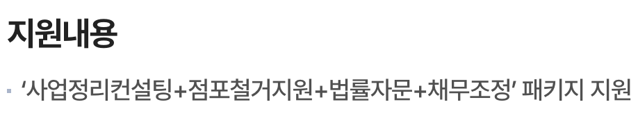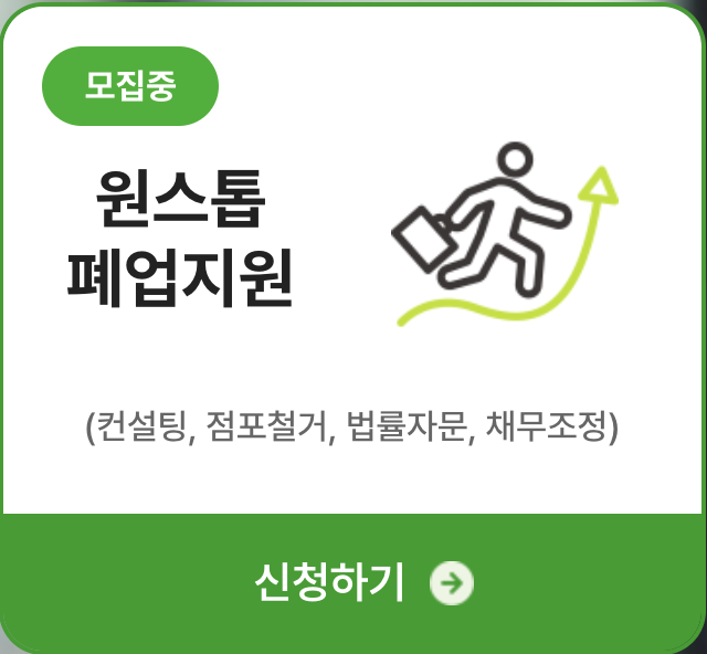 소상공인 폐업지원금은 '사업정리 컨설팅' + '철거 지원금' + '법률자문' + '채무조정'까지 원스톱으로 받을 수 있는 서비스 입니다.