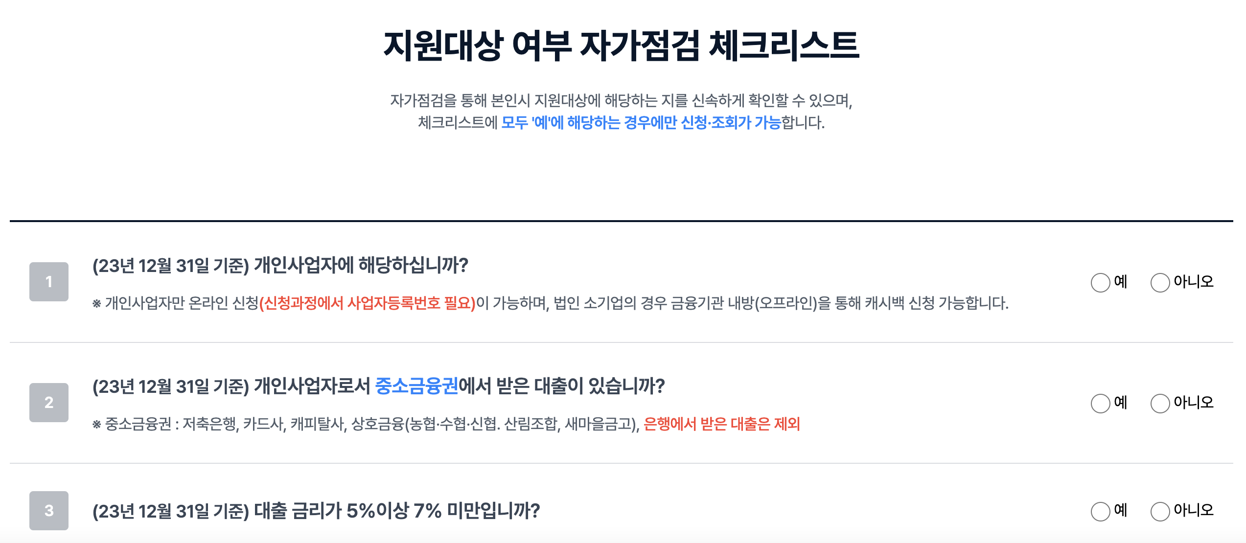 지금 공식 홈페이지에서 지원대상이 되는지 바로 확인할 수 있는 셀프 체크 리스트를 제공하고 있습니다.