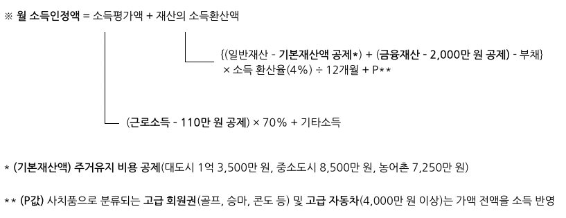 월 소득인정액은 본인 및 배우자의 소득평가액과 재산을 소득으로 환산한 금액을 합산한 것으로, 아래와 같은 방식으로 산정됩니다.