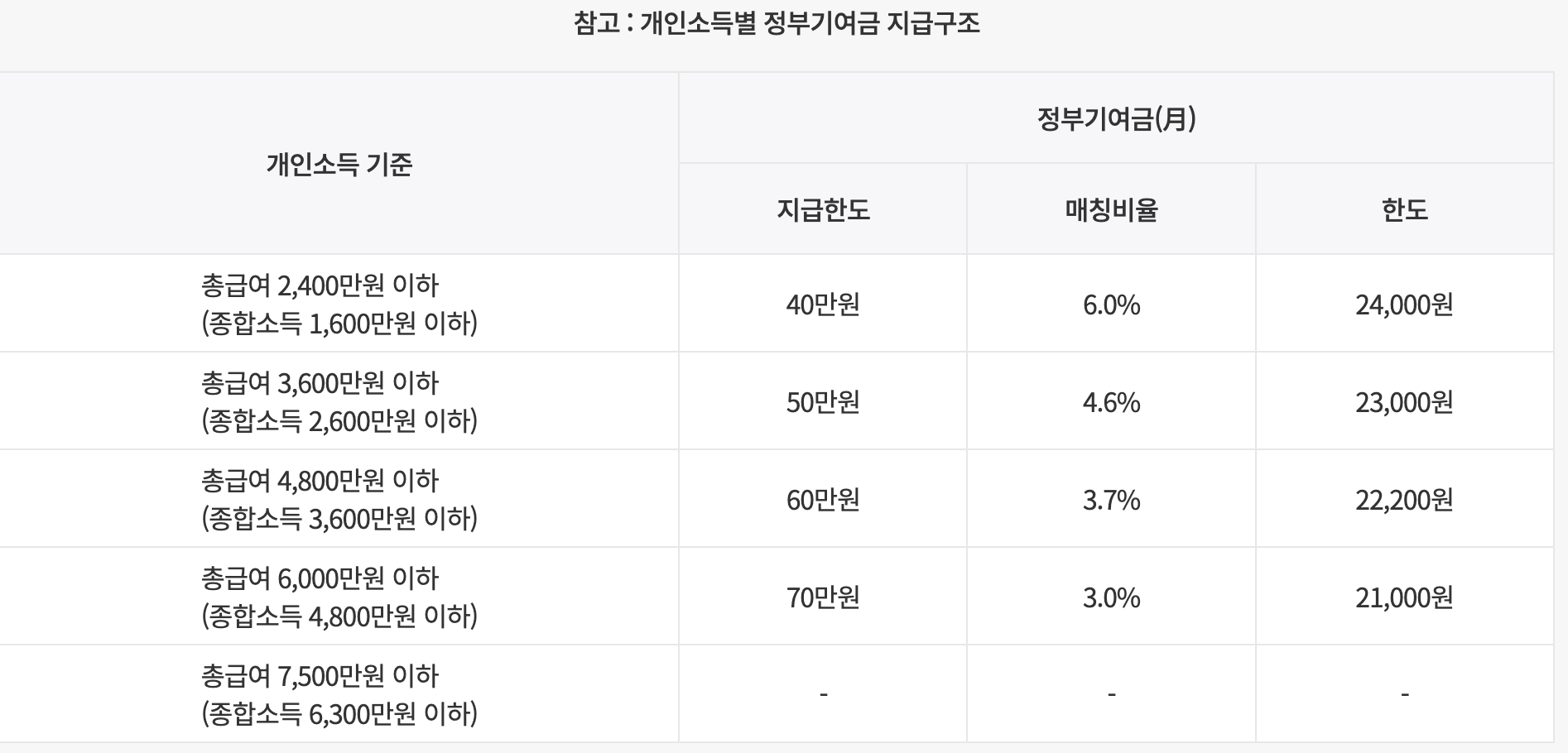 청년의 개인 소득 수준 및 적금 납입 금액에 따라 정부 기여금이 지급됩니다. 다만, 연간 소득이 6,000만원을 초과하거나 소득이 없는 경우, 정부 기여금은 지급되지 않습니다. 군 장병급여 또는 육아휴직급여만 있는 경우에는 정부 기여금 매칭비율 6%가 적용됩니다.
