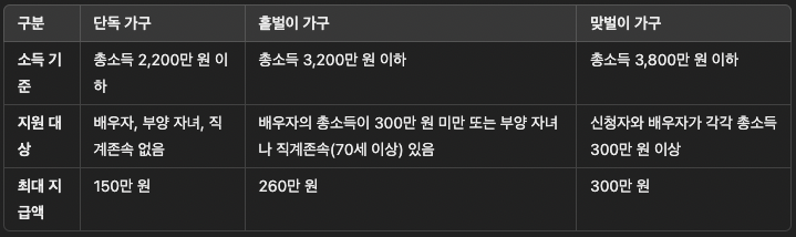 2022년부터는 소득 상한 금액이 200만 원씩 상향되어 더 많은 국민이 혜택을 받을 수 있게 되었으며, 단독가구는 연 소득 2,200만 원 이하, 홑벌이가구는 3,200만 원 이하, 맞벌이가구는 3,800만 원 이하가 지원 대상입니다.